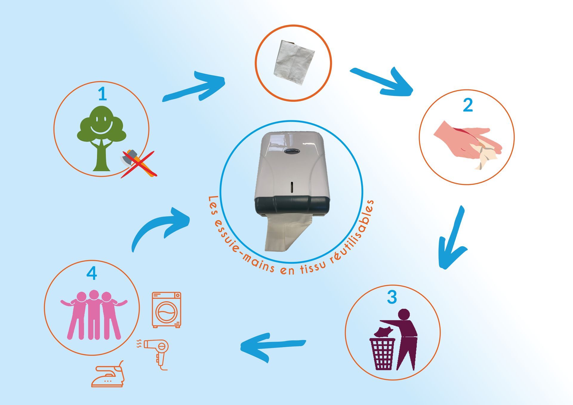 Une fois sales et mis dans la corbeille, les essuie-mains sont récupérés grâce au filet de récupération. Un employé de l'ISTA 49 vient les récupérer pour les emmener dans un ESAT en blanchisserie qui se chargera de laver, sécher et repasser ces lingettes pour qu'elles puissent revenir comme neuves, dans votre distributeur.